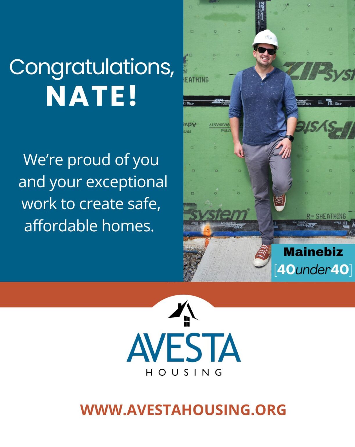 In his 40 Under 40 profile, Nate attributes his joining Avesta in 2019 as his “lightbulb moment”: “[I] realized I liked both the mission and challenge of developing affordable housing. I had never intended to be involved in real estate or housing production, but everything works out for a reason, and I really like the path I’ve chosen.”