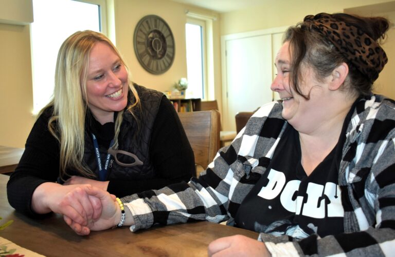 Avesta Housing Resident Service Coordinator Jen Stilwell, left, with Sheena, a new resident at River Turn in Conway, N.H. CONWAY, NH — Sheena is trying hard not to cry. She clutches a tissue, rolled